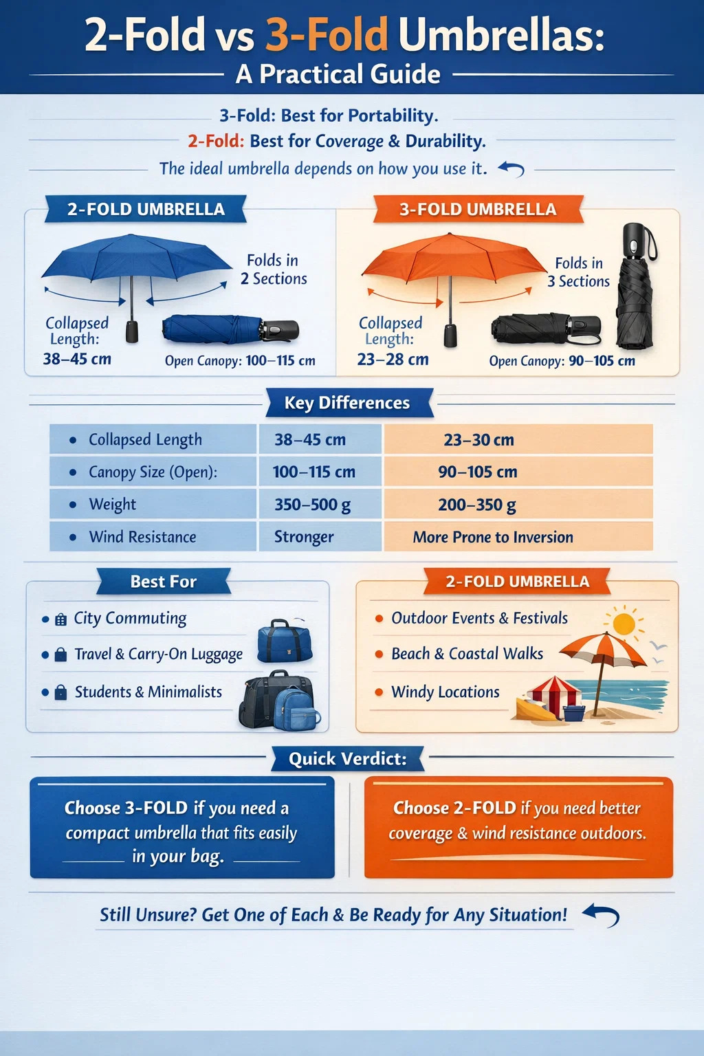 Jeśli potrzebujesz parasola do codziennych dojazdów do pracy, użytku biurowego lub podróży, gdzie jest mało miejsca w torbie, 3-krotny parasol jest prawie zawsze lepszym wyborem . Składa się do około 23–28 cm, mieści się w kieszeni marynarki lub małej torebce i jest na tyle lekki, że można go nosić niezauważenie. Jeśli natomiast spędzasz dużo czasu na świeżym powietrzu – niezależnie od tego, czy wybierasz się na plażę, stadion czy na wiejskie targi – 2-krotny parasol zapewnia zauważalnie większy baldachim, solidniejszą ramę i lepszą odporność na wiatr, kosztem większej masy do noszenia.