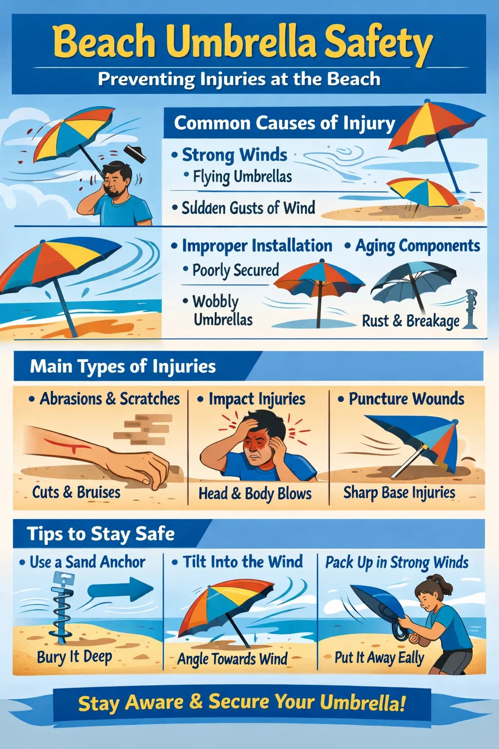 Chociaż wyjście na plażę ma służyć relaksowi, parasole plażowe , jeśli nie są odpowiednio zabezpieczone, mogą w rzeczywistości stać się potencjalnym zagrożeniem dla bezpieczeństwa. Co roku wiele osób doznaje kontuzji podczas korzystania ze słońca.