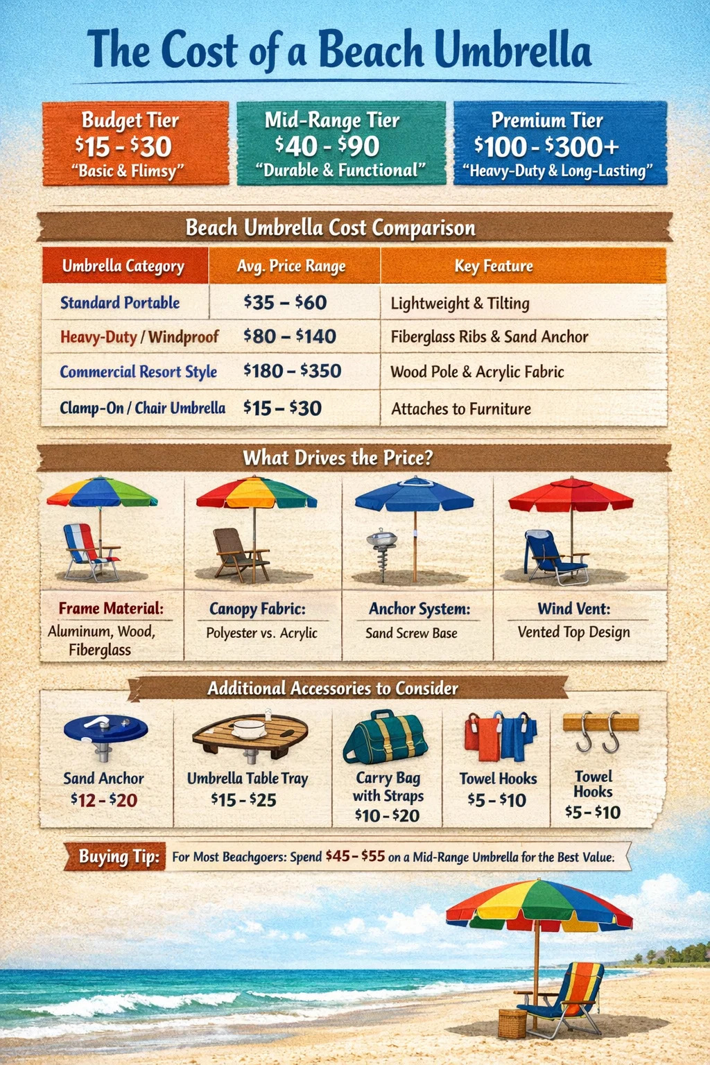 Dla zwykłego podróżnika, który dwa razy w roku wybiera się na plażę, wydając pieniądze 45 dolarów do 55 dolarów na średnim dystansie parasol plażowy to „słodki punkt”. Zapewnia wystarczającą trwałość, aby wytrzymać typową morską bryzę bez rozbijania banku. Jeśli mieszkasz w niewielkiej odległości od oceanu i planujesz cotygodniowe wizyty, inwestuj 120 dolarów lub więcej w modelu o dużej wytrzymałości z żebrami z włókna szklanego pozwoli Ci zaoszczędzić pieniądze i frustrację na dłuższą metę.