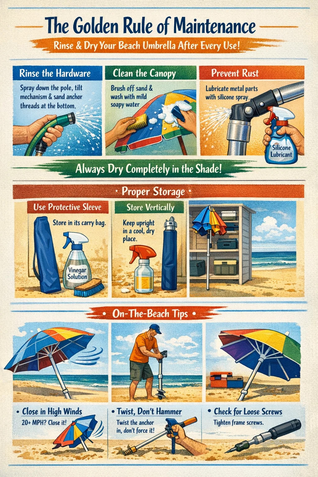 Sposób przechowywania sprzętu poza sezonem decyduje o tym, czy kupisz nowy parasol plażowy następne lato. Środowisko przechowywania powinno być chłodne, suche i wentylowane.