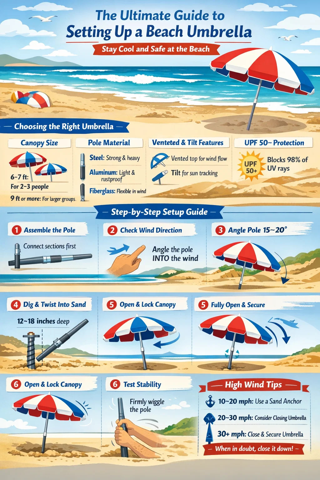 W tym przewodniku szczegółowo opisano każdy etap — od wyboru odpowiedniego parasola plażowego po utrzymanie go stabilnego w porywach przekraczających 30 km/h — dzięki czemu możesz spędzać mniej czasu na zmaganiu się ze sprzętem, a więcej na rozkoszowaniu się wodą.