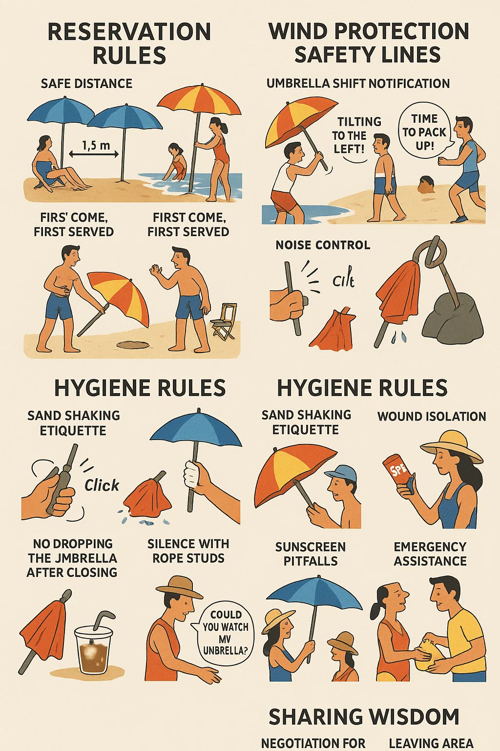 Etykieta potrząsania piaskiem: Przed zamknięciem parasola potrząśnij nim trzy razy w odosobnionym miejscu, aby uniknąć przedostania się piasku do kanapek innych osób.