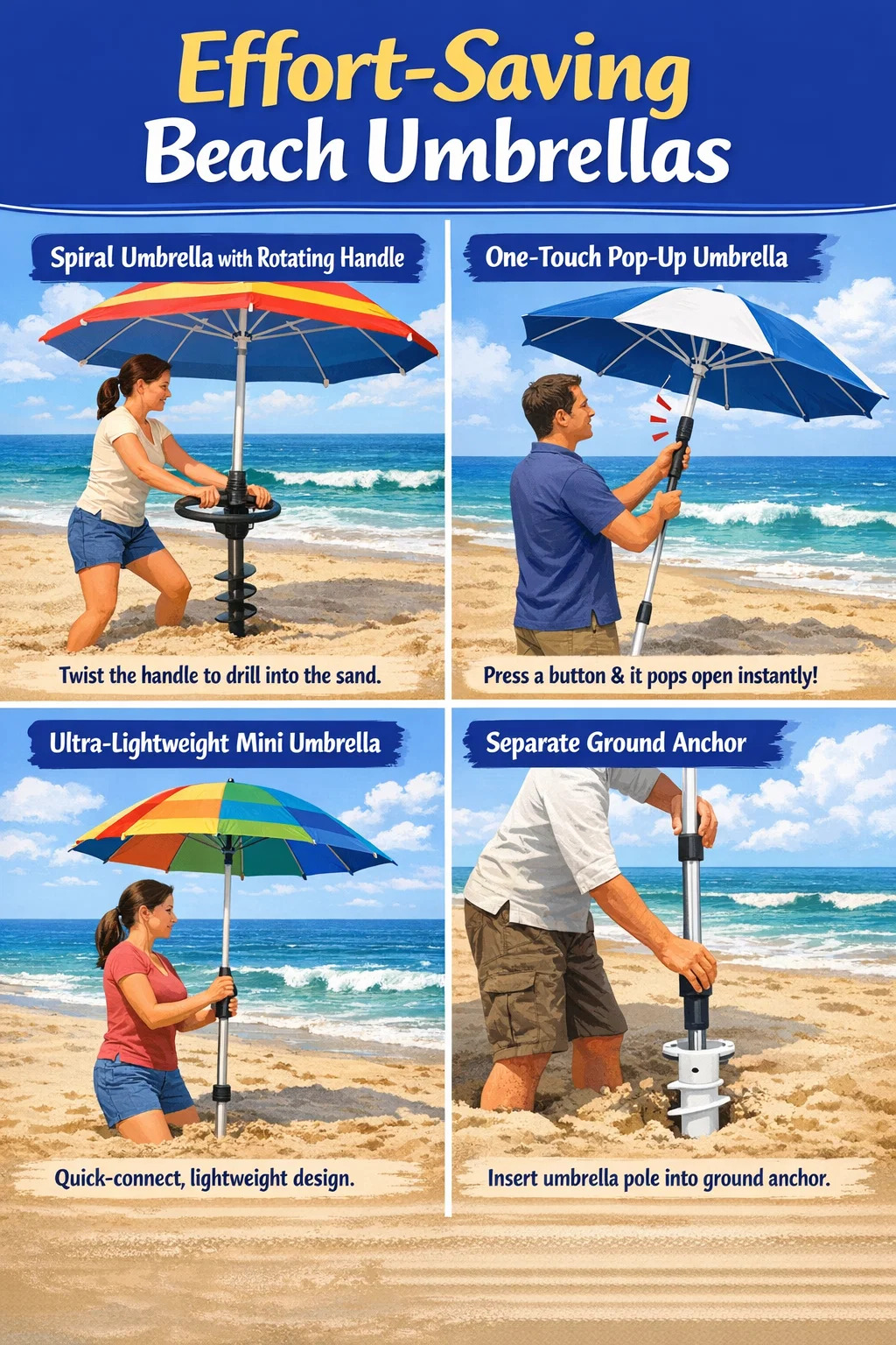 Jeśli szukasz parasola plażowego, którego rozłożenie nie wymaga ogromnego wysiłku, to zdecydowanie najlepszym wyborem będą modele „jednego dotknięcia” lub „oszczędzające wysiłek”.