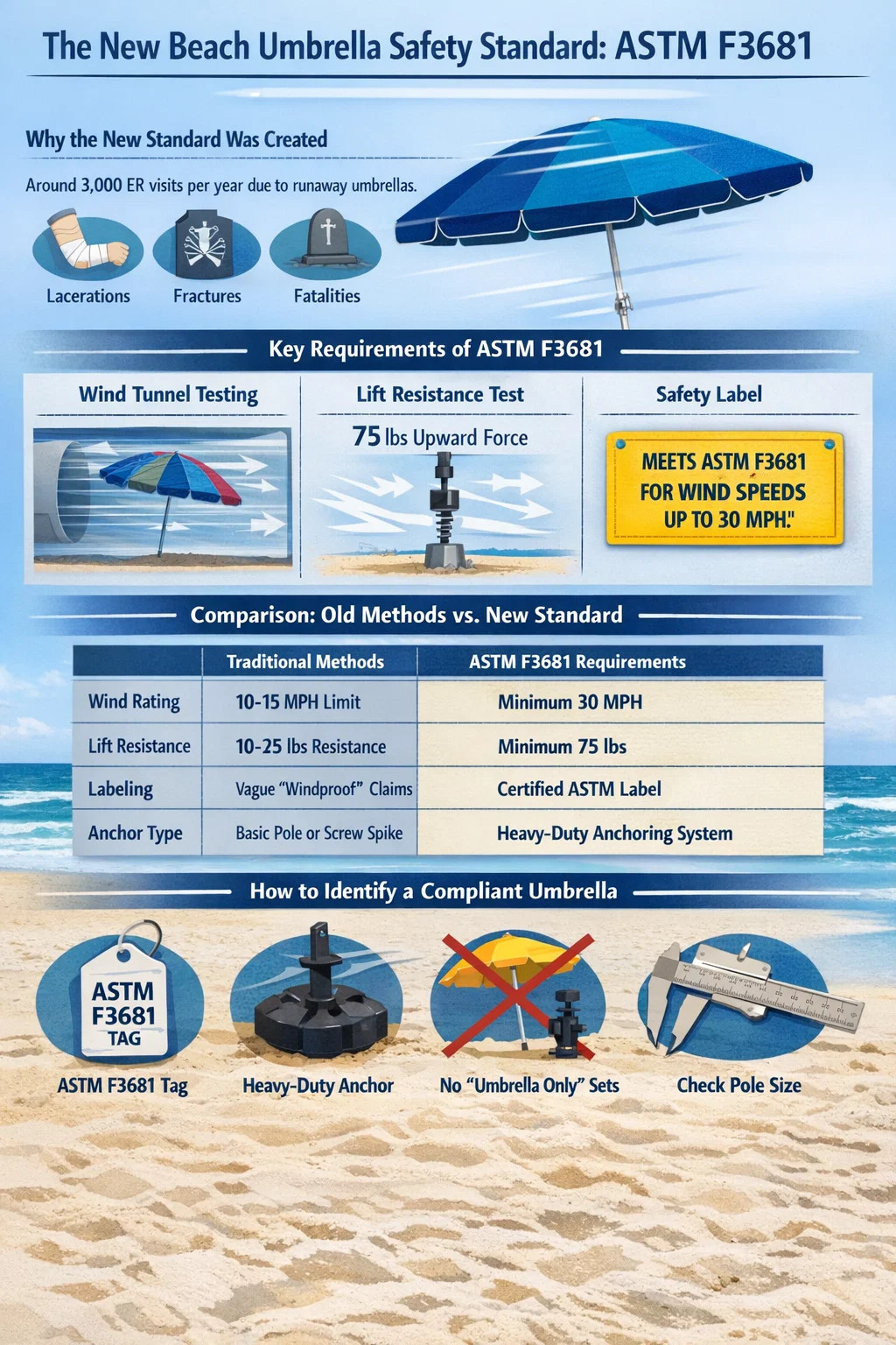 The nowy standard parasoli plażowych to ASTM F3681-24 (zaktualizowany do F3681-25) , który ustanawia pierwsze oficjalne wymagania eksploatacyjne dotyczące odporności na wiatr i bezpieczeństwa kotwiczenia. Zgodnie z tymi nowymi wytycznymi, standardem parasol plażowy o średnicy 7,5 stopy musi wytrzymać prędkość wiatru do 30 mil na godzinę (MPH) nie wznosząc się w powietrze. Dodatkowo system kotwiczenia musi zapewniać min 75 funtów oporu przed siłami nośnymi skierowanymi do góry, aby zapewnić, że pozostanie stabilnie osadzony w piasku.
