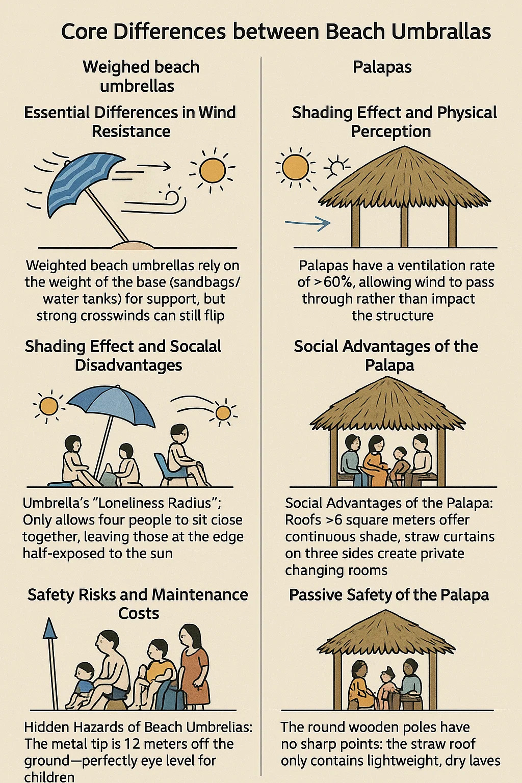 Ograniczenia ochrony przeciwsłonecznej parasola plażowego: Cień pod parasolem zmienia się wraz z kątem padania promieni słonecznych, co wymaga częstej regulacji. Srebrna powłoka słabo odbija promieniowanie cieplne z gruntu, dlatego nawet w południe, gdy powierzchnia piasku ma 60°C, temperatura pod parasolem może jeszcze przekroczyć 40°C. Palapas zapewniają naturalne chłodzenie: pogrubione liście palmowe raczej pochłaniają ciepło niż je odbijają, utrzymując stały poziom wilgotności (mierzony na plaży, 3-5°C niższy niż pod parasolem); pełna osłona przeciwsłoneczna nie wymaga regulacji.