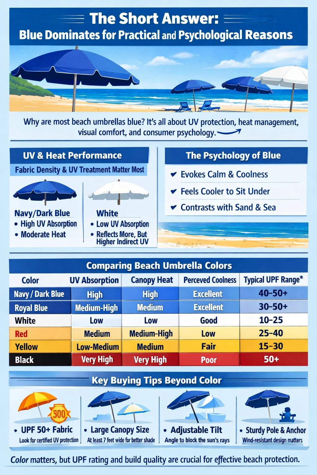 | Kolor | Absorpcja UV | Ciepło powierzchniowe baldachimu | Postrzegany chłód | Komfort wizualny na plaży | Typowy zakres UPF* |